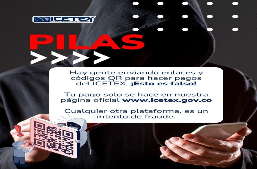 Hay gente enviando enlaces y códigos QR para hacer pagos del ICETEX. ¡Esto es falso! Tu pago solo se hace en nuestra página oficialwww.icetex.gov.co Cualquier otra plataforma, es un intento de fraude.